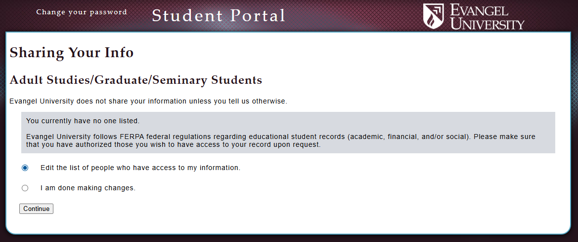 - The student will navigate and sign-in to the Student Portal - https://web.evangel.edu/Portal/Student/index.asp